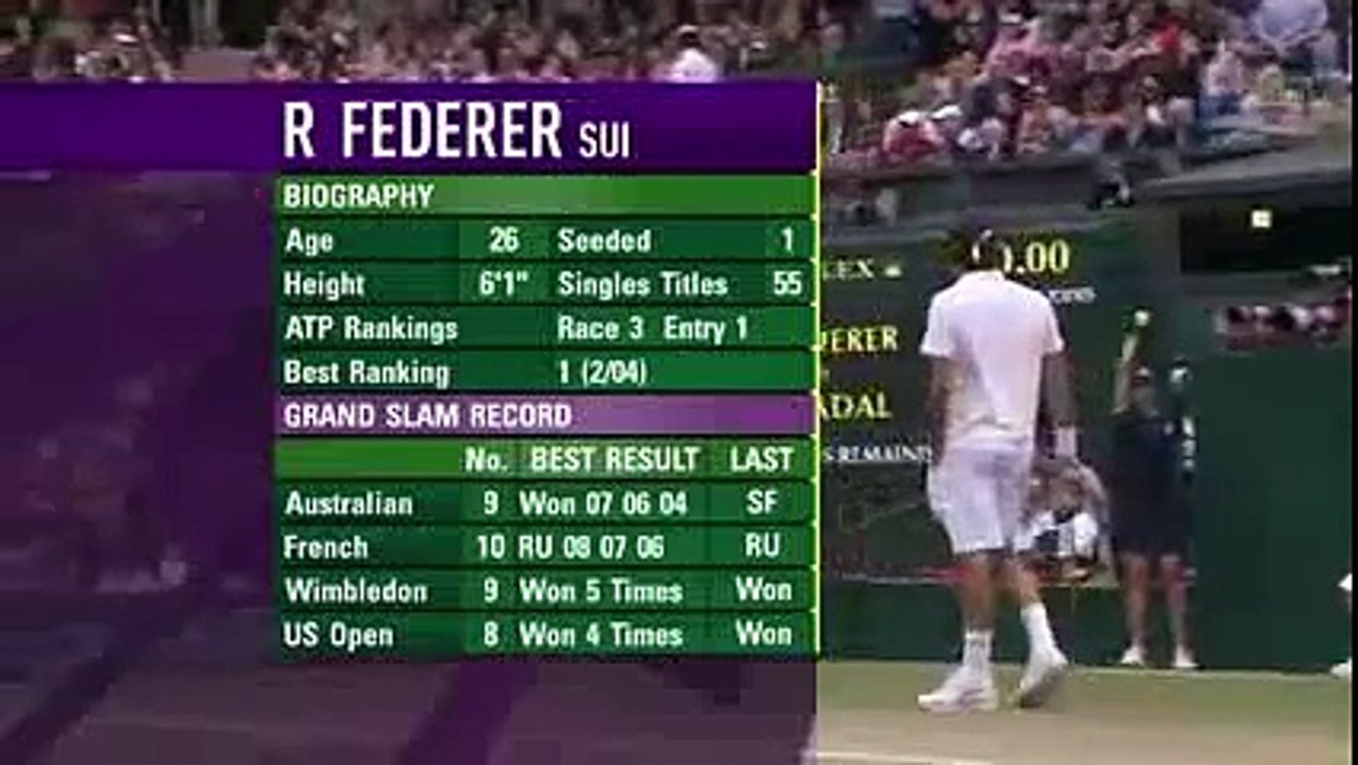 2008 Wimbledon F. Nadal came into Wimbledon 1145 points behind Federer. Roger Federer player profile.