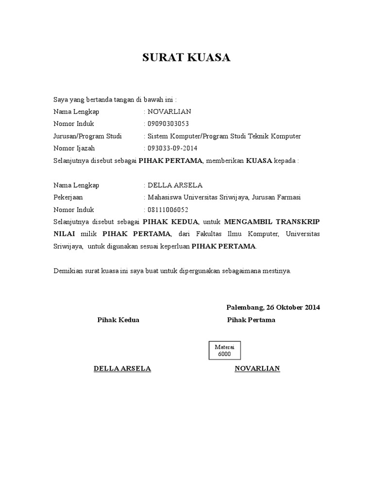 Berikut adalah contoh surat kuasa pengambilan dokumen notaril: